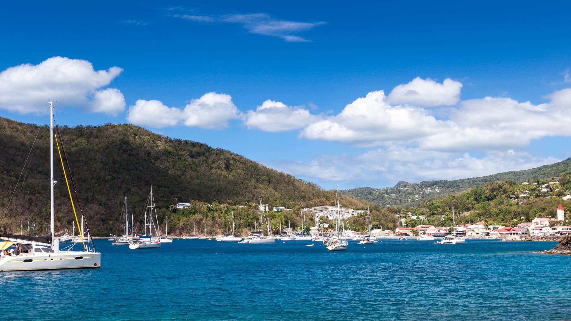 Ici c'est Deshaies ! Nous sommes en Basse Terre, qui comme ne l'indique pas son nom, est la partie volcanique avec plus de relief, de rivières et cascades, une forêt tropicale et une terre très riche. La côte "sous le vent" sur laquelle nous sommes situés est donc plus abritée par le relief, en terme de vent et de pluie.